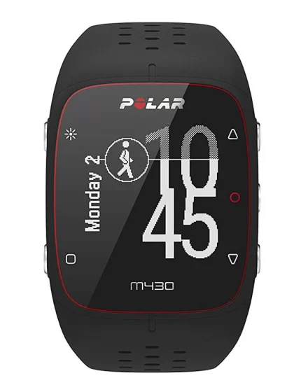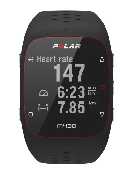 Wbudowany moduł GPS: wbudowany w Polar M430 moduł GPS umożliwia kontrolowanie tempa, przebytego dystansu, pokonanej trasy oraz aktualnej wysokości n.p.m. W przypadku braku sygnału GPS, zegarek pracuje, analizując wykonywane ruchy nadgarstka.