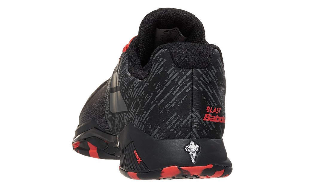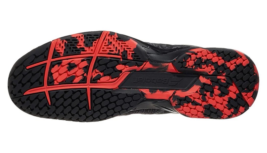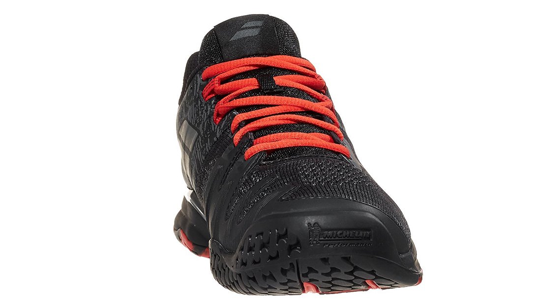 Uniwersalna podeszwa na wszystkie rodzaje kortów tenisowych wykonana z gumy Michelin (logo marki na pięcie buta) DIN-20 zapewnia redukcję wstrząsów oraz diametralnie zmniejsza zużycie podeszwy.