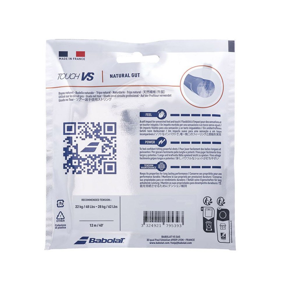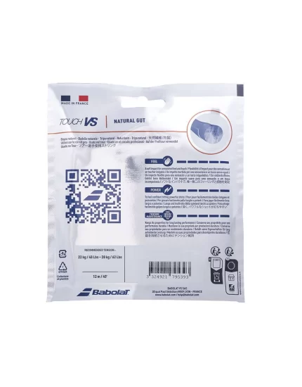 Najwyższej klasy, dopracowany w każdym szczególe naciąg naturalny. Babolat VS Touch zapewnia wyjątkową moc, komfort gry i największą sprężystość spośród naciągów. Naciąg ten można stosować we wszystkich rakietach. Rekomendowana siła naciągu: 22 - 28 kg.