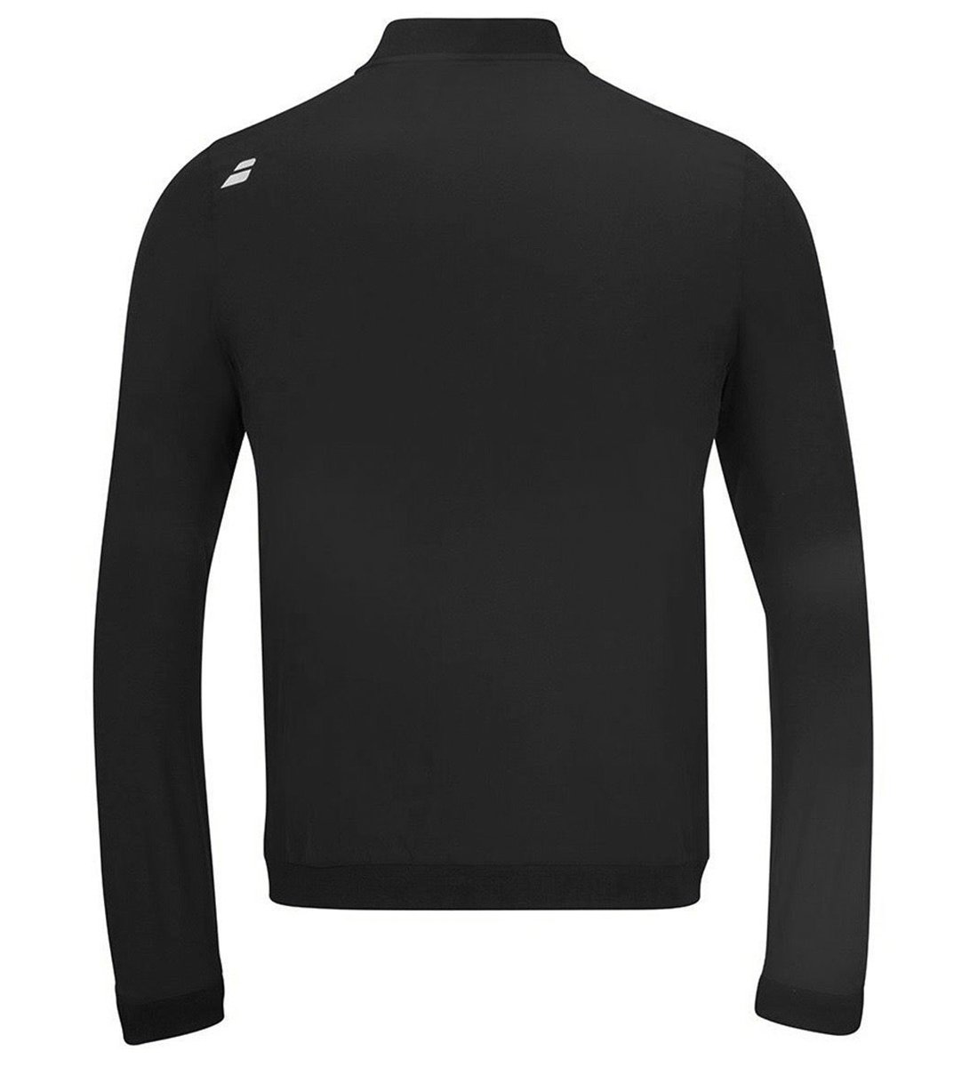 Czarna, bluza treningowa do tenisa Babolat Play Jacket dla chłopca. Zapinana na całej wysokości za pomocą suwaka. Suwak w górnej części posiada zabezpieczenie przeciwko otarciom.