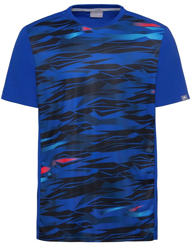 Chłopięca wielokolorowa koszulka tenisowa Head Slider T-Shirt B XK z 2020 roku. Wielokolorowy T-Shirt nada się do treningu, do gry meczowej lub do codziennego użytku. Posiada ciekawy motyw graficzny składający się z odcieni granatowego, niebieskiego i czerwonego koloru. Plecy w kolorze niebieskim. Wykonana z wysokogatunkowego poliestru.