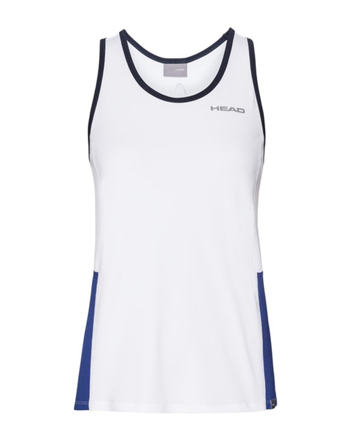 Biało niebieski, dziewczęcy top tenisowy Head Club Tank. Sportowa koszulka na ramiączka posiada specjalne płaskie szwy, które zmniejszają ryzyko jakichkolwiek podrażnień czy otarć. Cały materiał koszulki jest niesamowicie elastyczny. Krój koszulki jest bardzo dopasowany, świetnie się układa, a co za tym idzie niesamowicie wygląda na ciele.