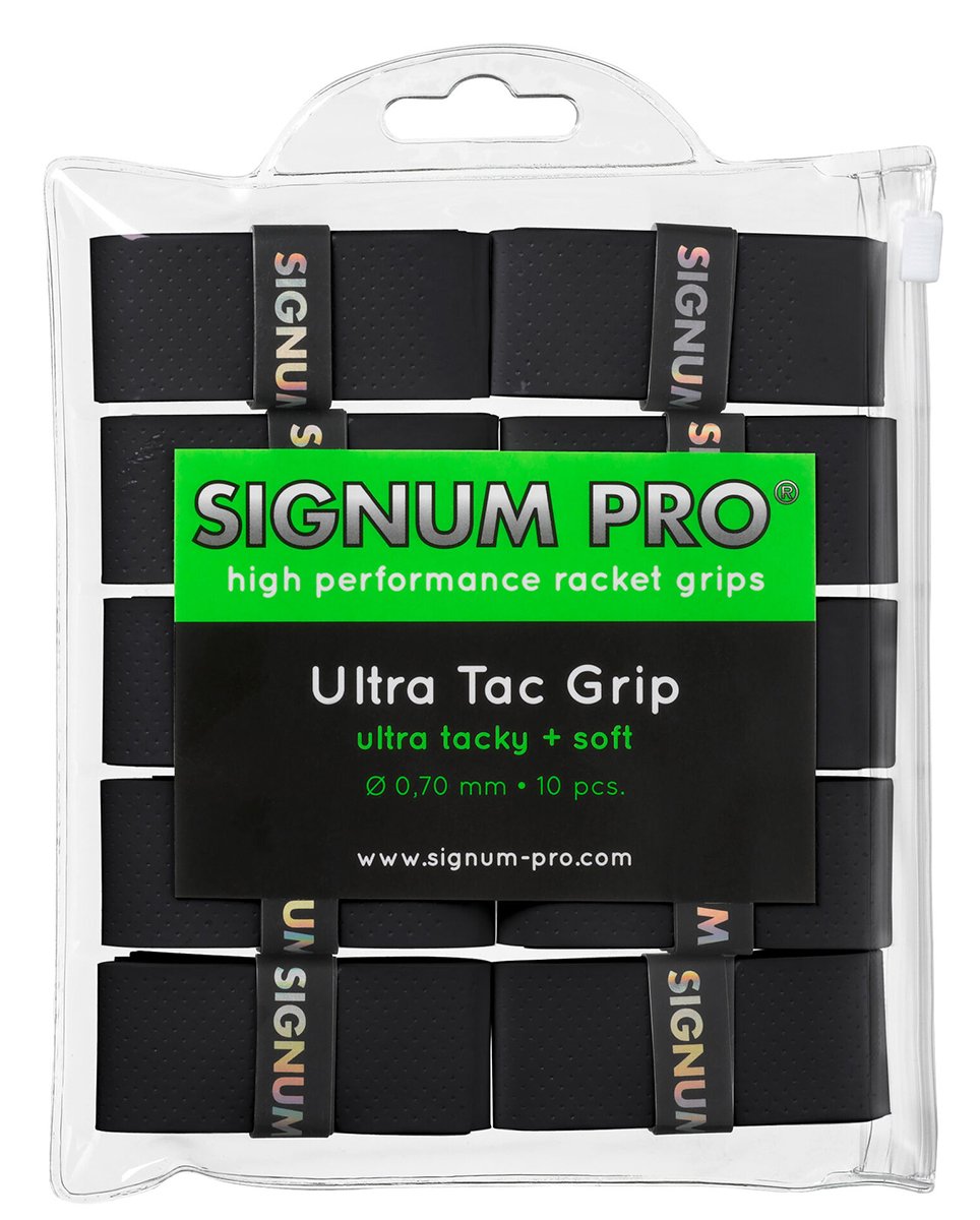 Miękkie i przylepne czarne owijki wierzchnie Signum Pro Ultra Tac Grip Black. Liczne otworki o średnicy ok. 1 mm szybko odprowadzają wilgoć do owijki bazowej. Owijki Ultra Tac Grip przyczyniają się do lekkiego wytłumiania drgań powstałych w momencie uderzenia w piłkę.